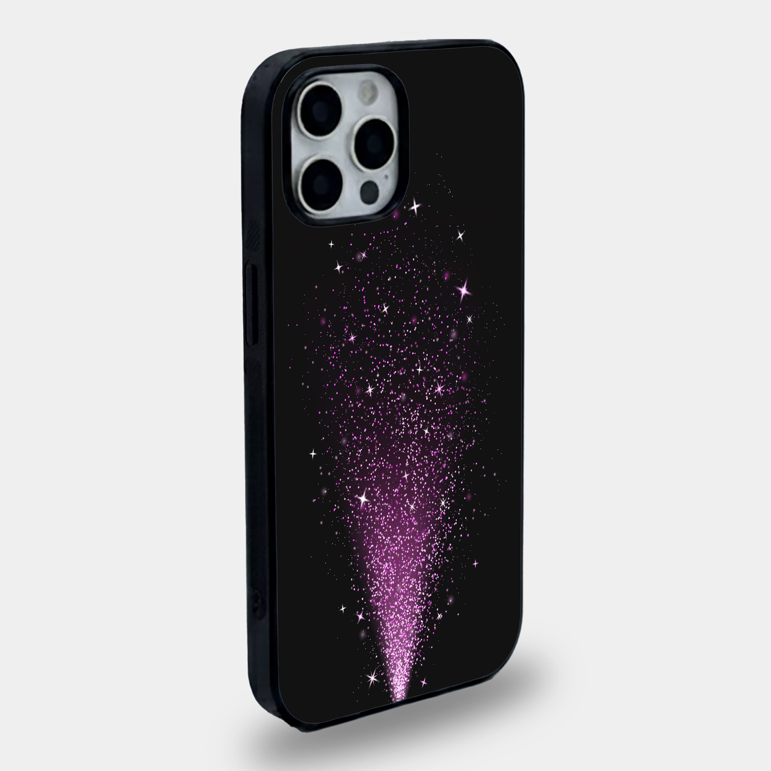 Elevate your everyday tech into a piece of celestial art. This design features a cascading fountain of shimmering violet and magenta particles, erupting from the base like a silent firework. Set against a rich, matte-black backdrop, the vibrant stars and soft-glow nebulae create a 3D depth effect that turns your phone into a conversation starter.