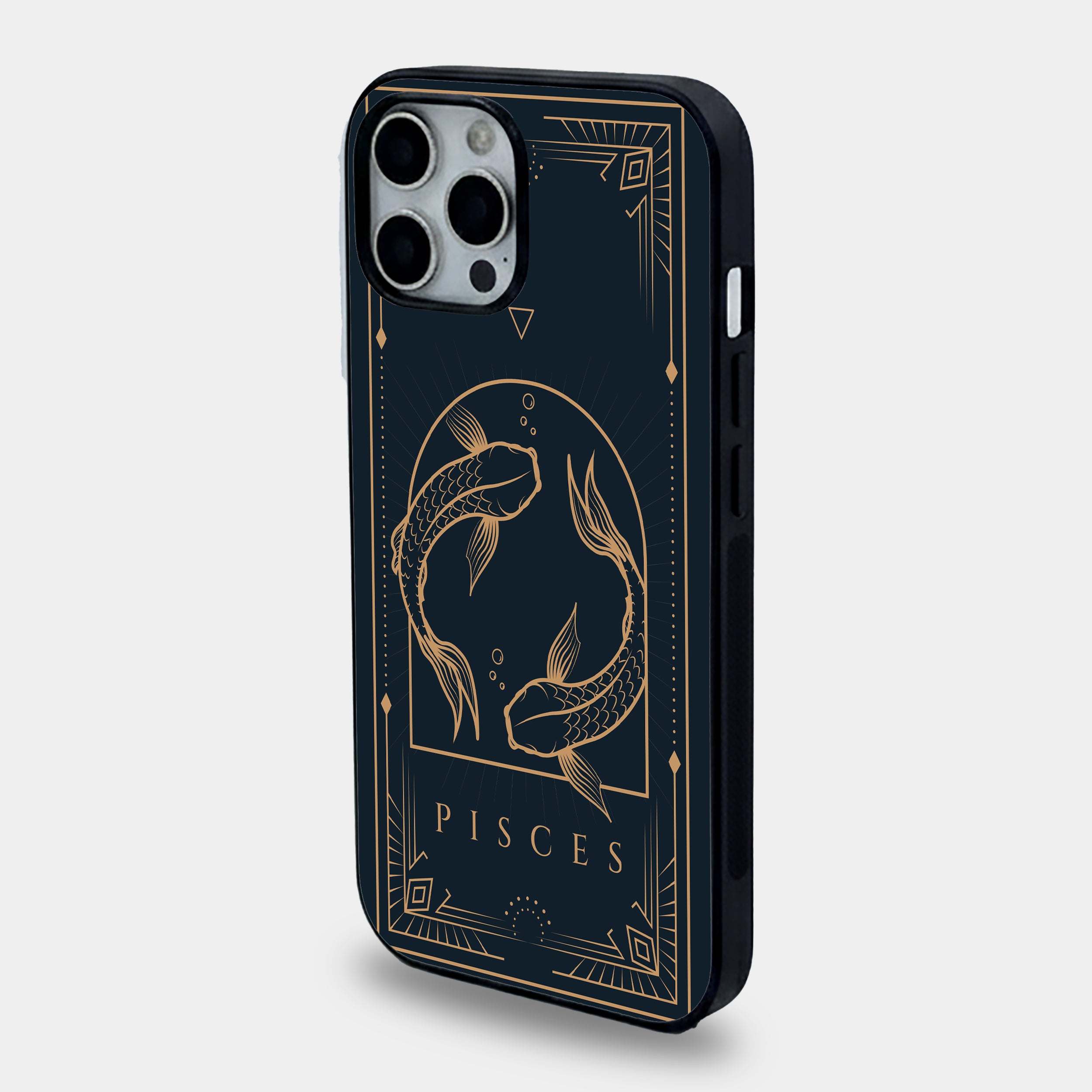 Featuring a striking gold-line art illustration of the iconic twin fish, this design is housed within a luxurious Art Deco frame on a deep midnight navy background. Whether you are a deep-feeling Pisces yourself or looking for the perfect astrology gift, this case offers the perfect balance of mystical charm and sophisticated style.