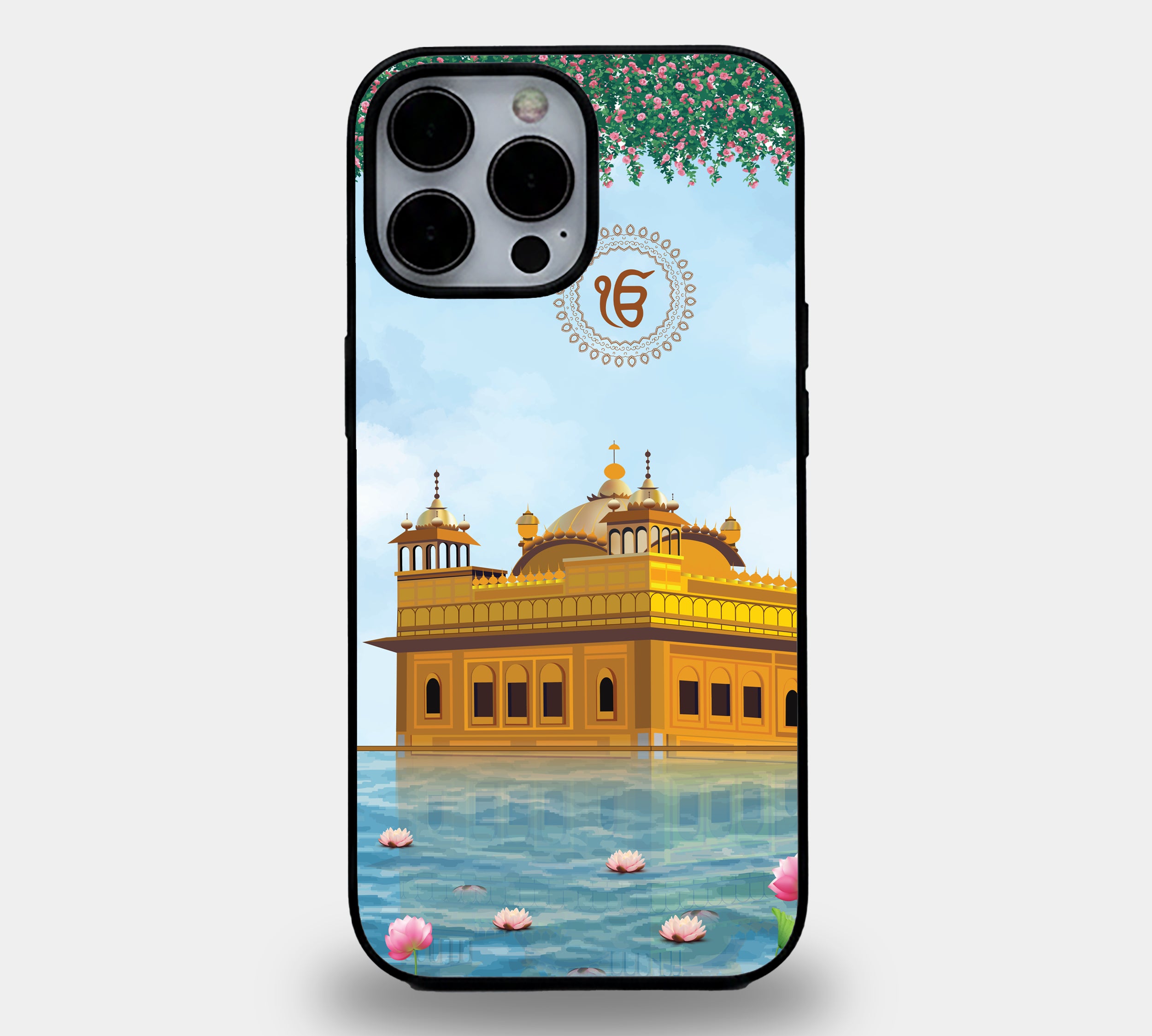 Adorned with the sacred Ik Onkar symbol and framed by a delicate canopy of roses, this design brings a sense of peace and spiritual protection to your device. The bottom of the case depicts the tranquil holy waters with blooming lotus flowers, symbolizing purity and resilience.