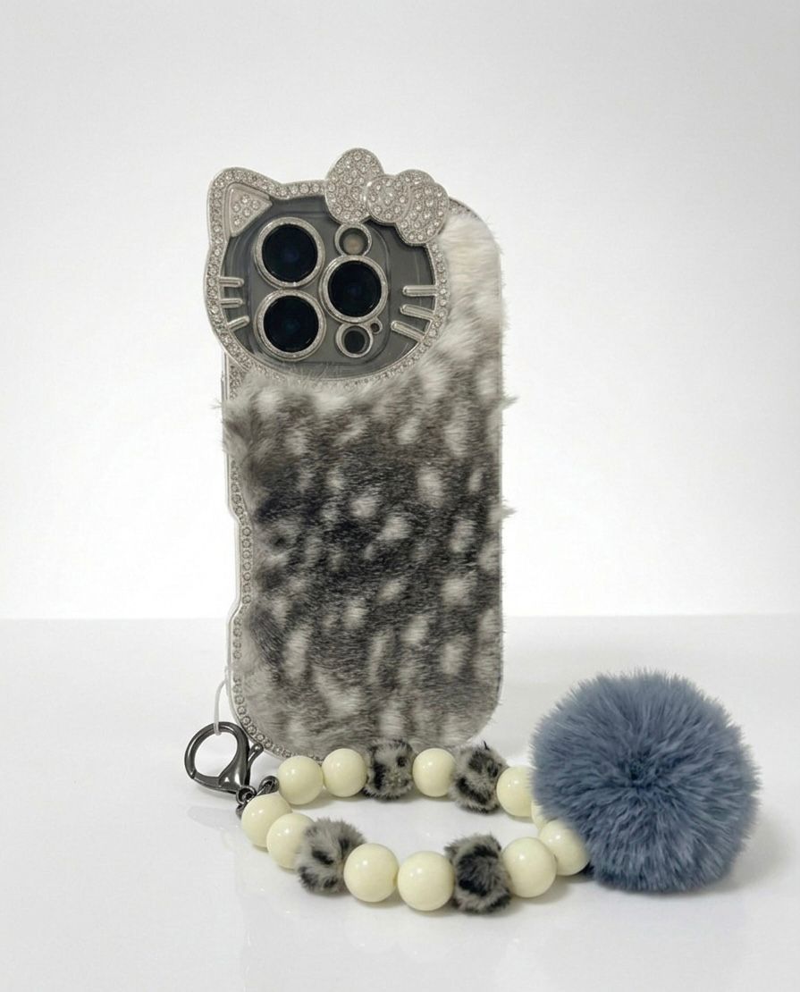Luxury Black Cat Fur with Crystal Camera Frame & Pom-Pom Wristlet | Premium iPhone Mobile Cover Case