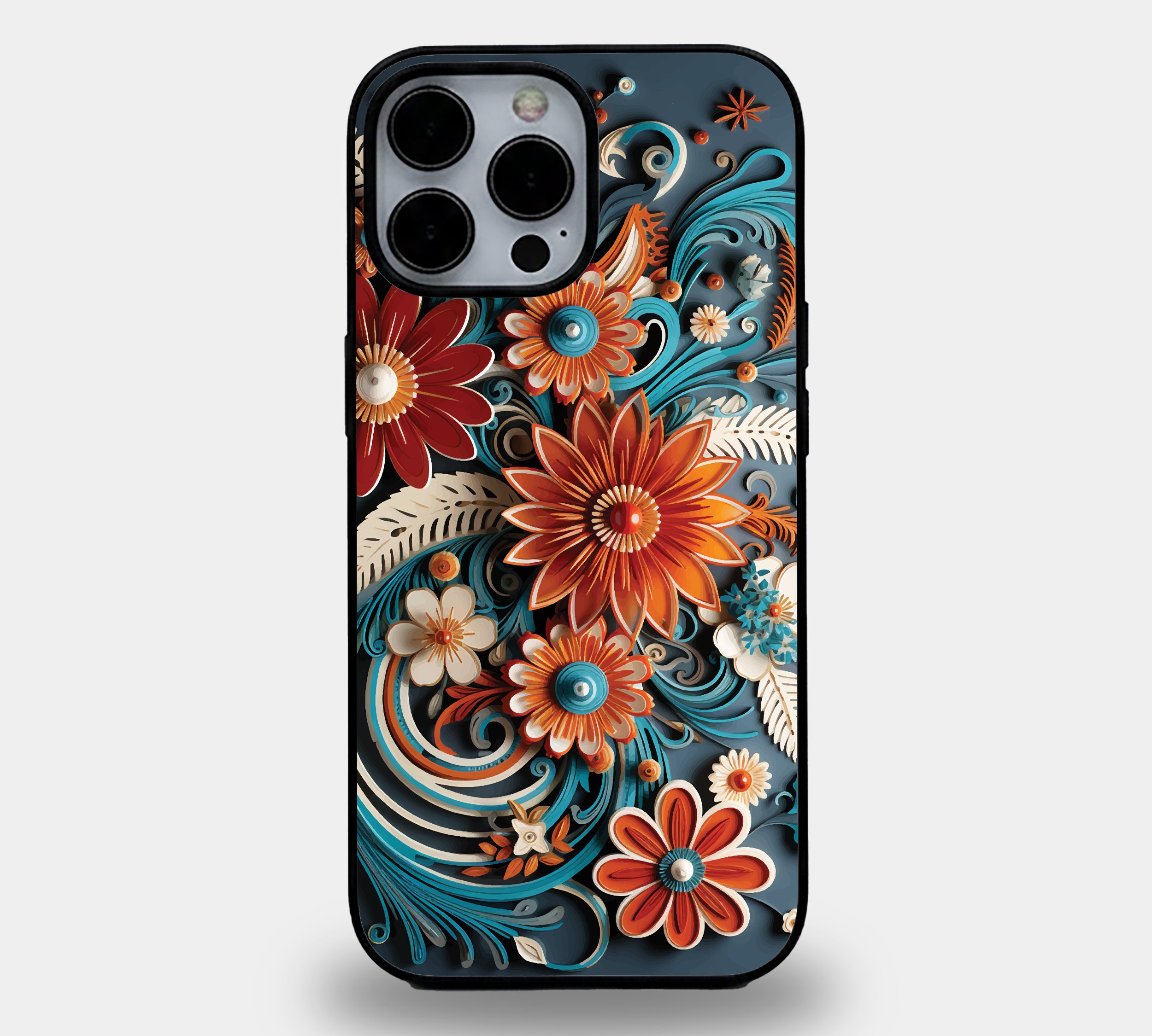 Transform your smartphone into a canvas of intricate artistry. Inspired by the ancient art of paper quilling, our Floral Filigree mobile cover features a breathtaking explosion of layered textures. Rich burnt orange petals, creamy ivory accents, and flowing teal swirls create a visual depth that looks like it’s leaping right off your phone. This isn't just a case; it’s a statement of elegance and craftsmanship.