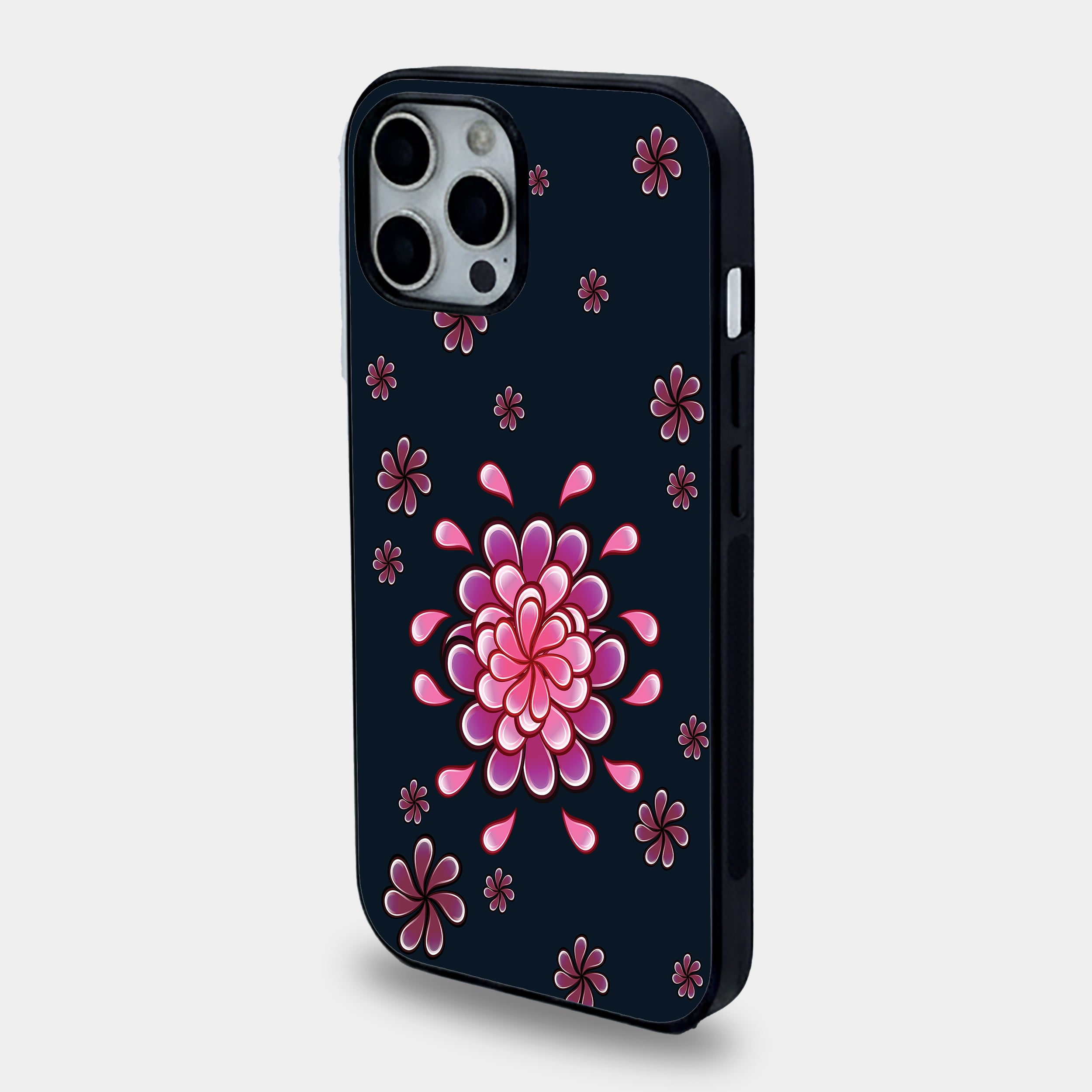 This isn’t just a floral pattern; it’s a study in luminous depth. Featuring a central, multi-layered mandala flower surrounded by swirling "floating" blossoms, the design mimics the beauty of a garden under a midnight sky. The glossy, glass-like finish on the petals gives the impression of light reflecting off a dewy surface, providing your phone with a 3D aesthetic that feels premium to the touch.