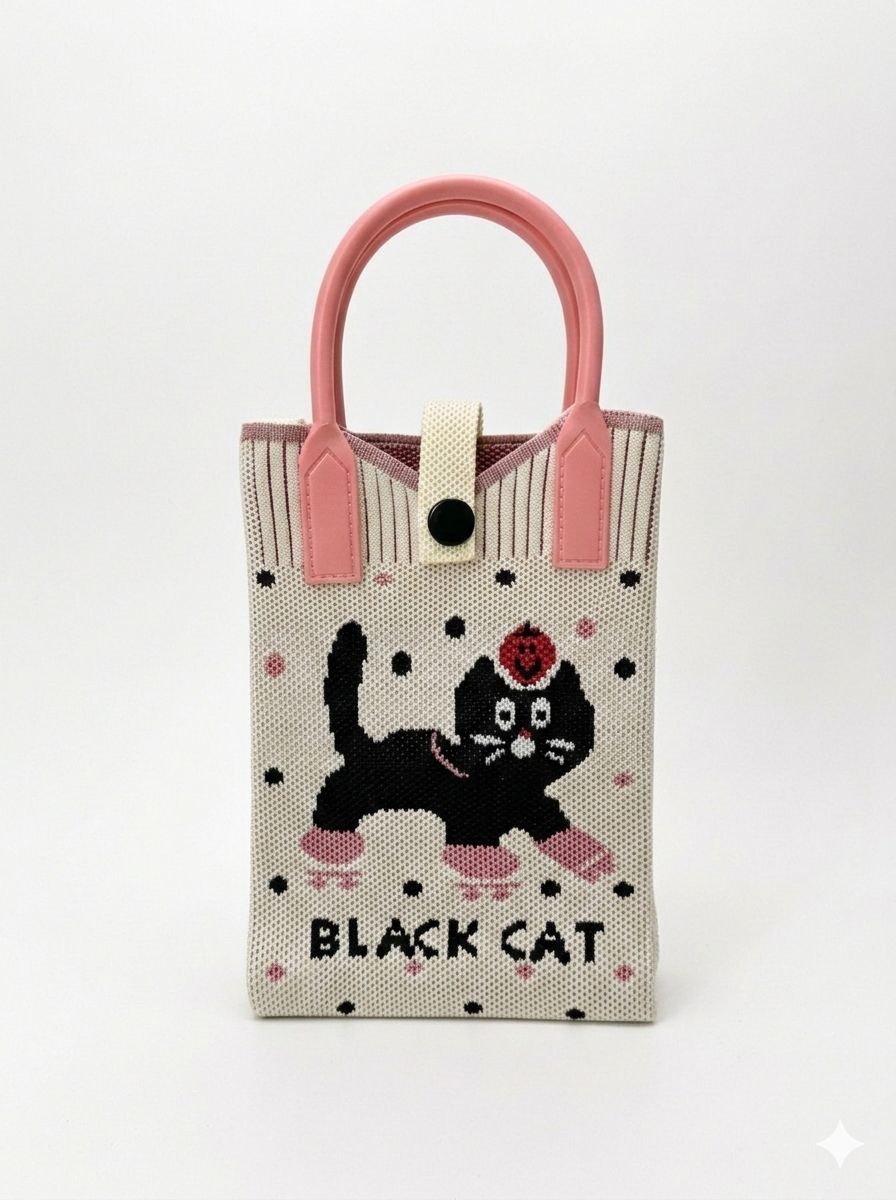 Trendy Crossbody Mobile Sling Bag with Strap & Silicone Handle | Pink Black Cat